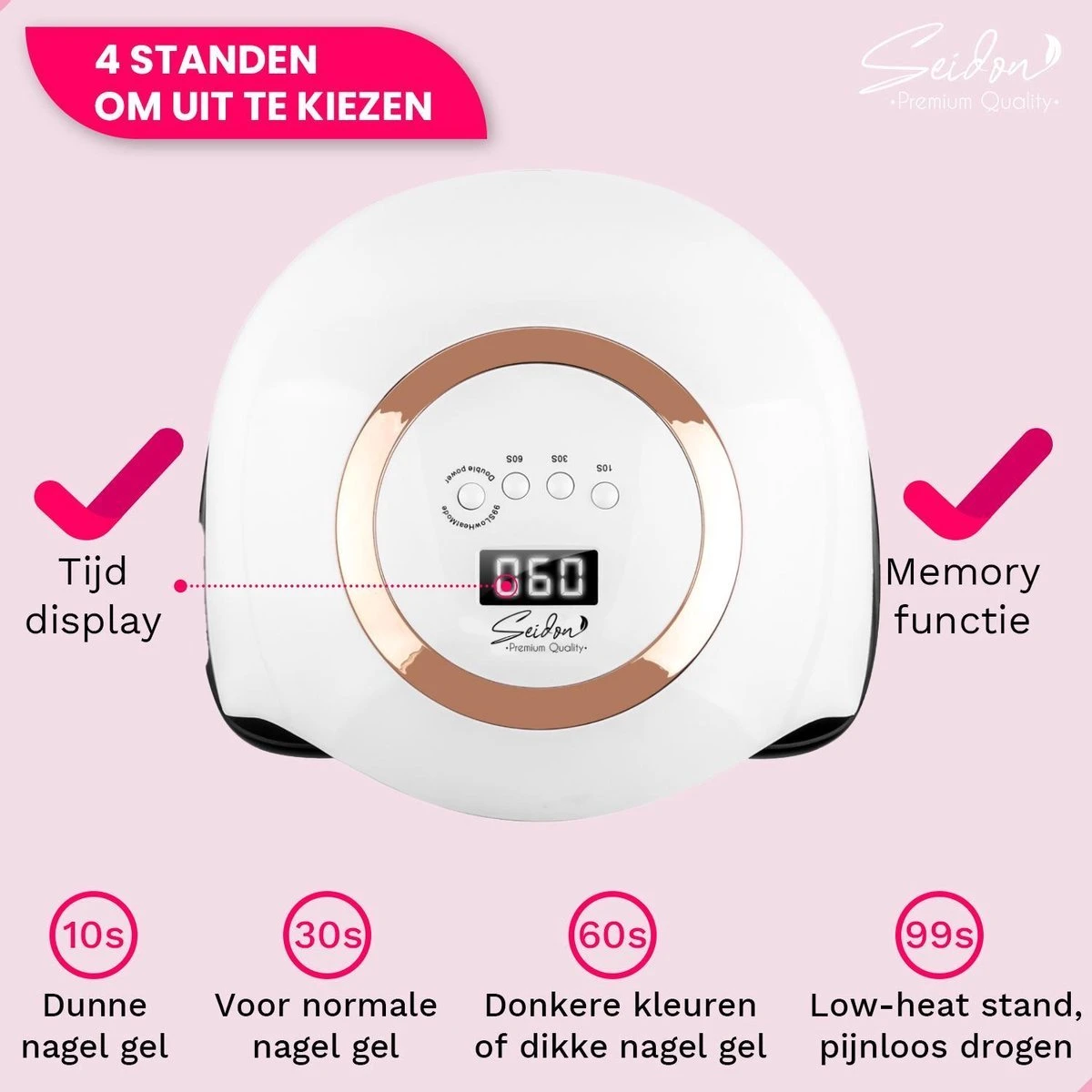 Met de Seidon nageldroger voor gelnagels zijn je nagels in een mum van tijd droog. Deze nageldroger hard je nagels in slechts 10 tot 60 sec uit dankzij een krachtig vermogen van 168W en 42 UV LED lampjes. Ideaal voor alle soorten gelnagellak. Vergeet die dure nagelsalon en doe je nagels snel en professioneel vanuit huis!