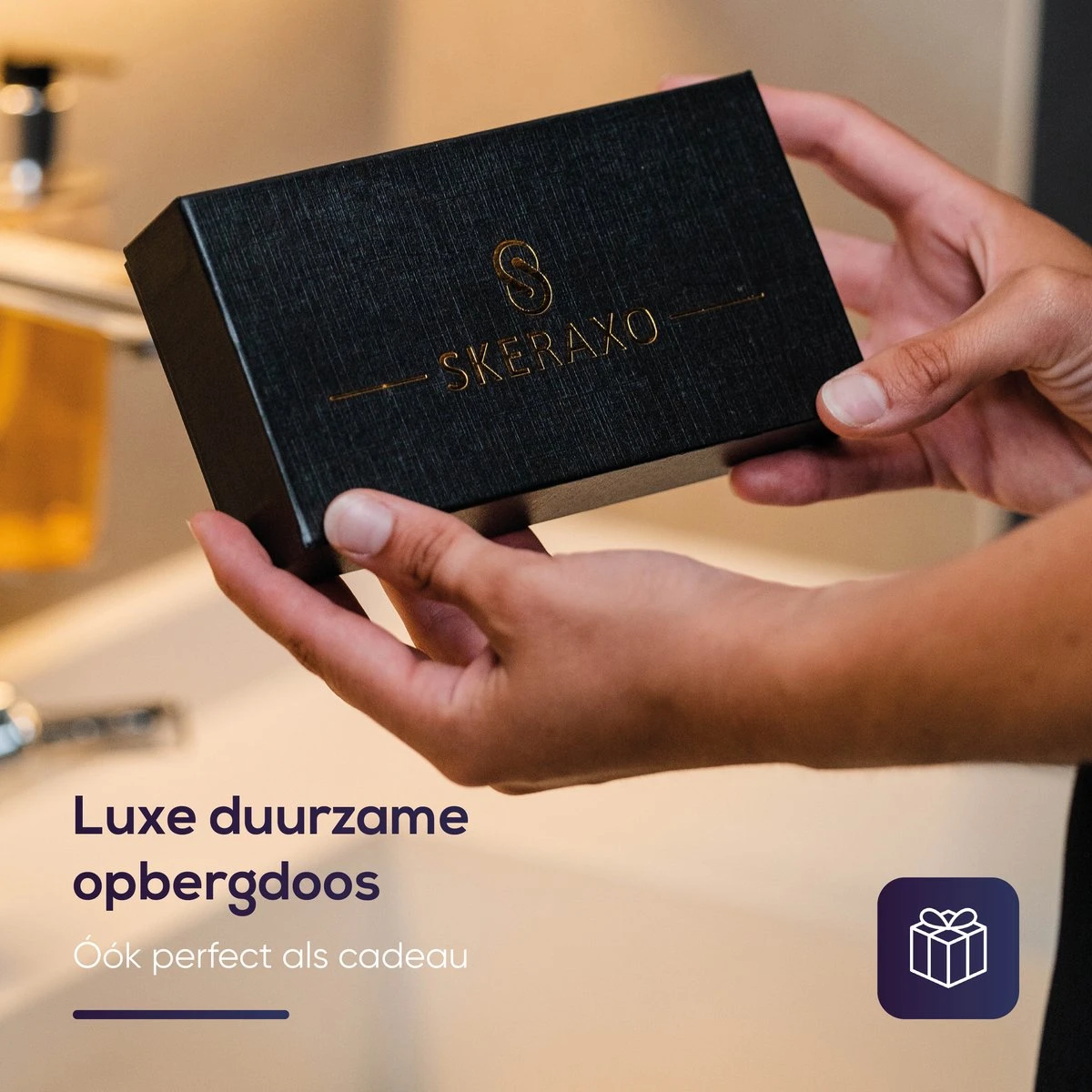 De pedicure set wordt geleverd in een luxe opbergdoos van zacht materiaal; ideaal voor onderweg of als verjaardagscadeau. Zo is de set makkelijk mee te nemen en fijn in gebruik, thuis of van huis.