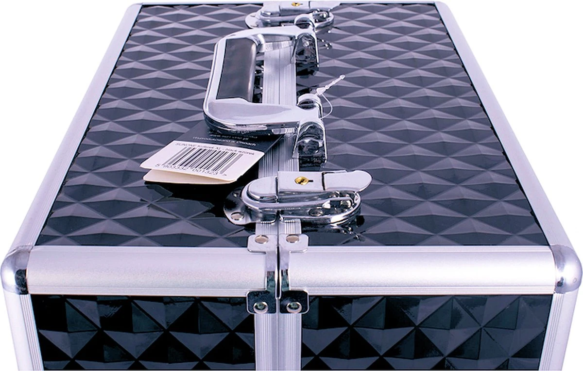 In de stevige, opvouwbare en optimaal bemeten make up koffer XL Zwart kun je eenvoudig een full-size UV- en LED-lamp plaatsen. De make-up koffer XL Zwart gaat aan beide zijden open en heeft 2 verschuifbare planken voor kleine gebruiksvoorwerpen, zoals hybride nagellakken, penselen, kleine en grote cosmetica. Door het lage gewicht perfect voor veldwerk. Het is een stijlvolle make up koffer voor het presenteren van producten tijdens officiële bijeenkomsten, bijvoorbeeld zakelijke bijeenkomsten.