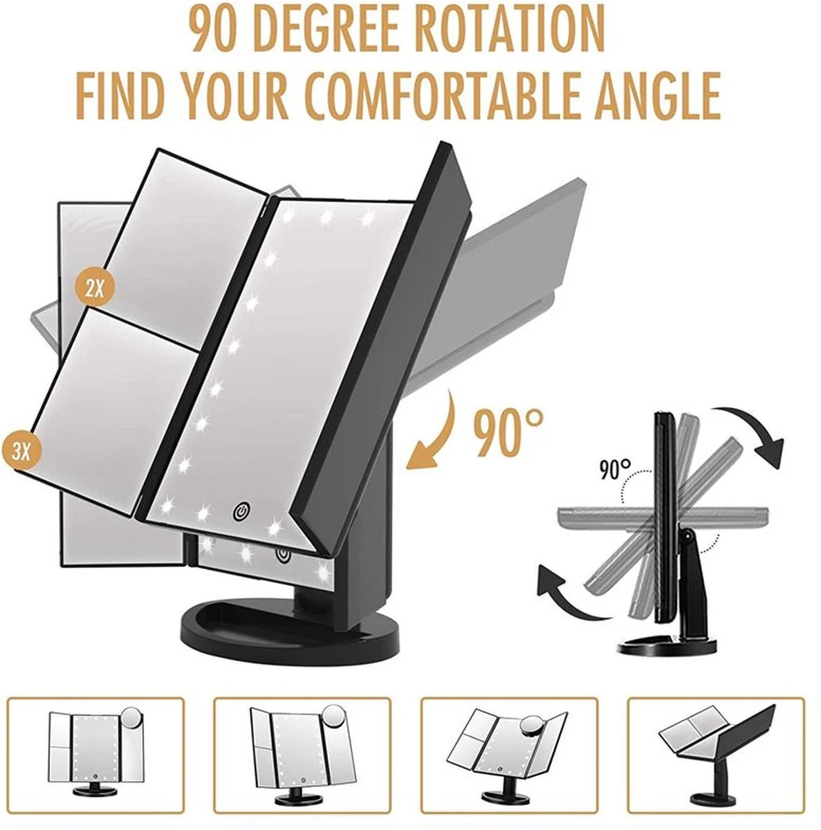 UNIQ Trifold Make Up Spiegel Met LED Verlichting En 2 Vergrootspiegels – Staande Spiegel – 21 LED-lampjes – Op Batterijen En USB (kabel Incl) – Zwart